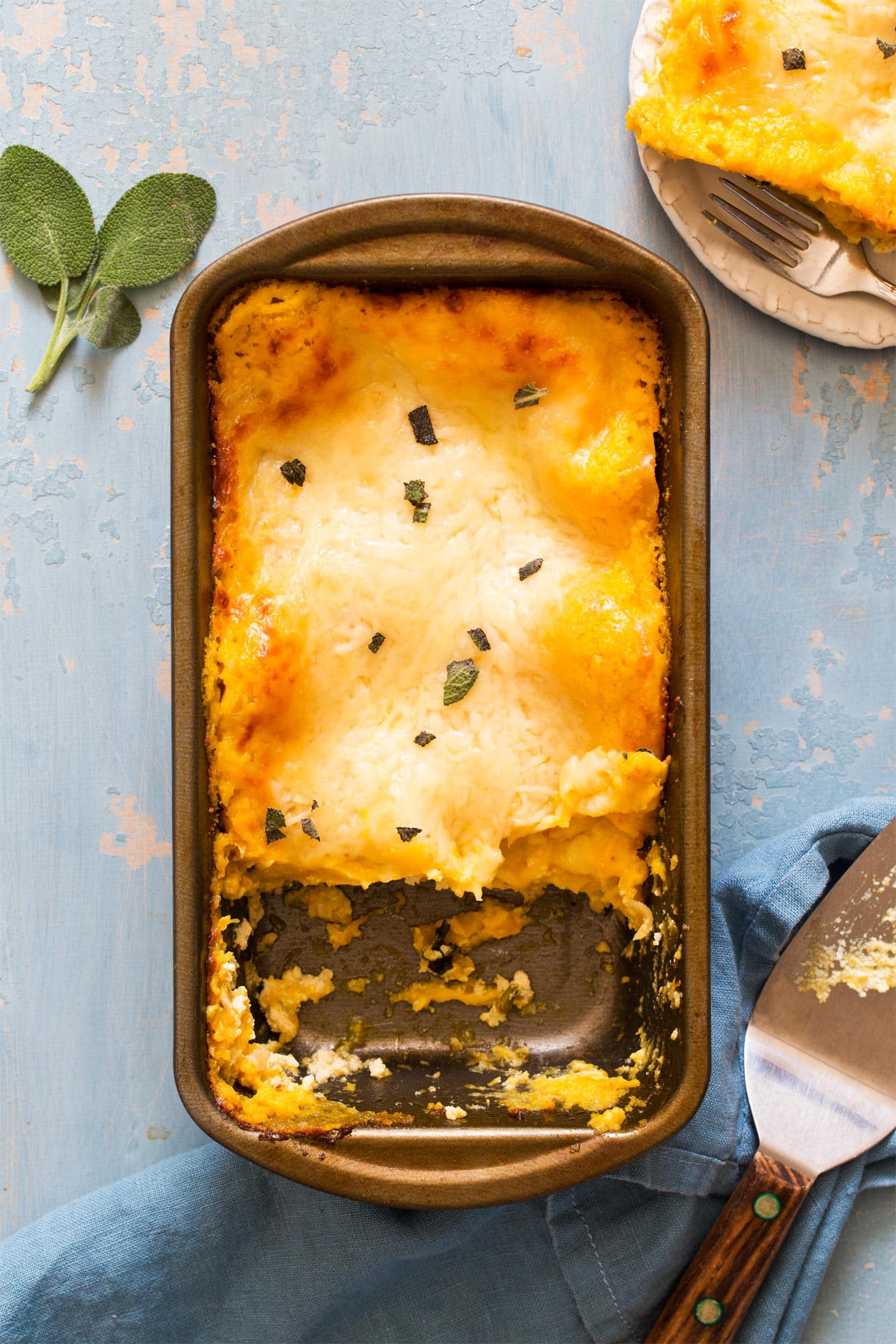 - Remove the foil and bake another 15 minutes or until the top is browned. Let sit about 15 minutes before cutting and serving. Garnish with sage, if desired.