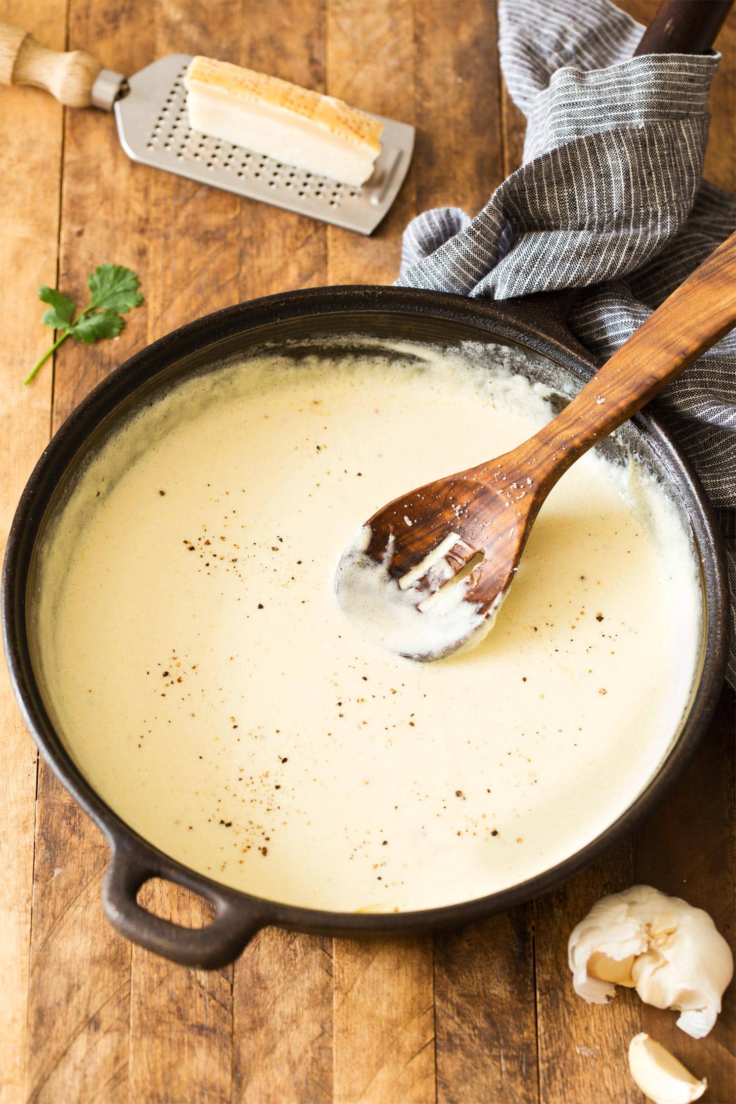 - Salt and pepper: You won’t need to add as much salt thanks to the Parmesan cheese (a naturally salty ingredient), but you still may want a big pinch or two. The black pepper also adds a touch of spiciness to balance all that fat.
