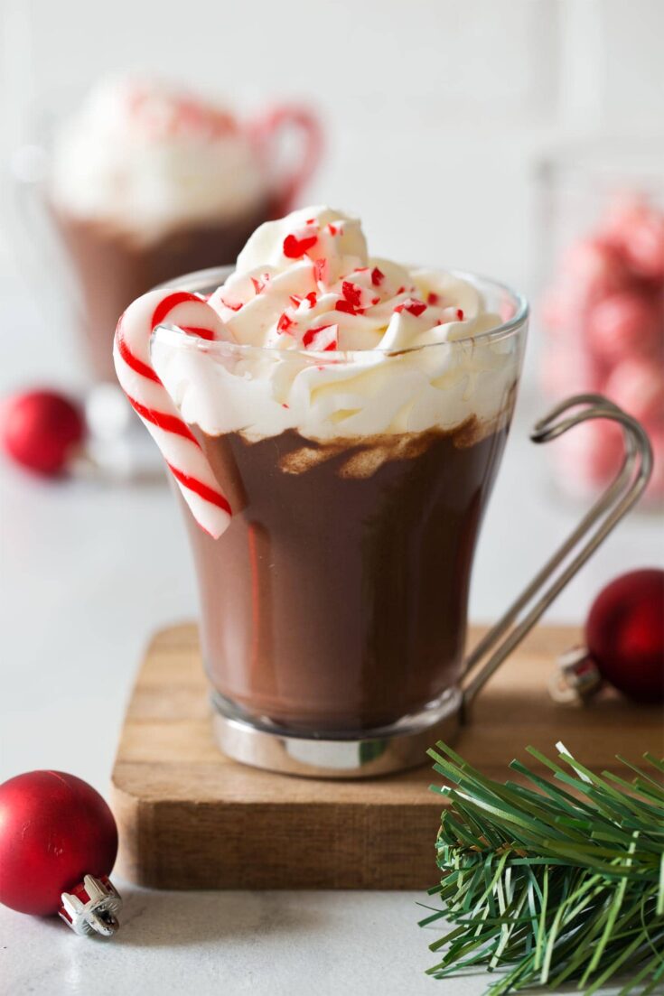 It’s a festive Christmas hot chocolate from scratch that tastes like the holidays. On top I garnished it with peppermint whipped cream and crushed candy canes.