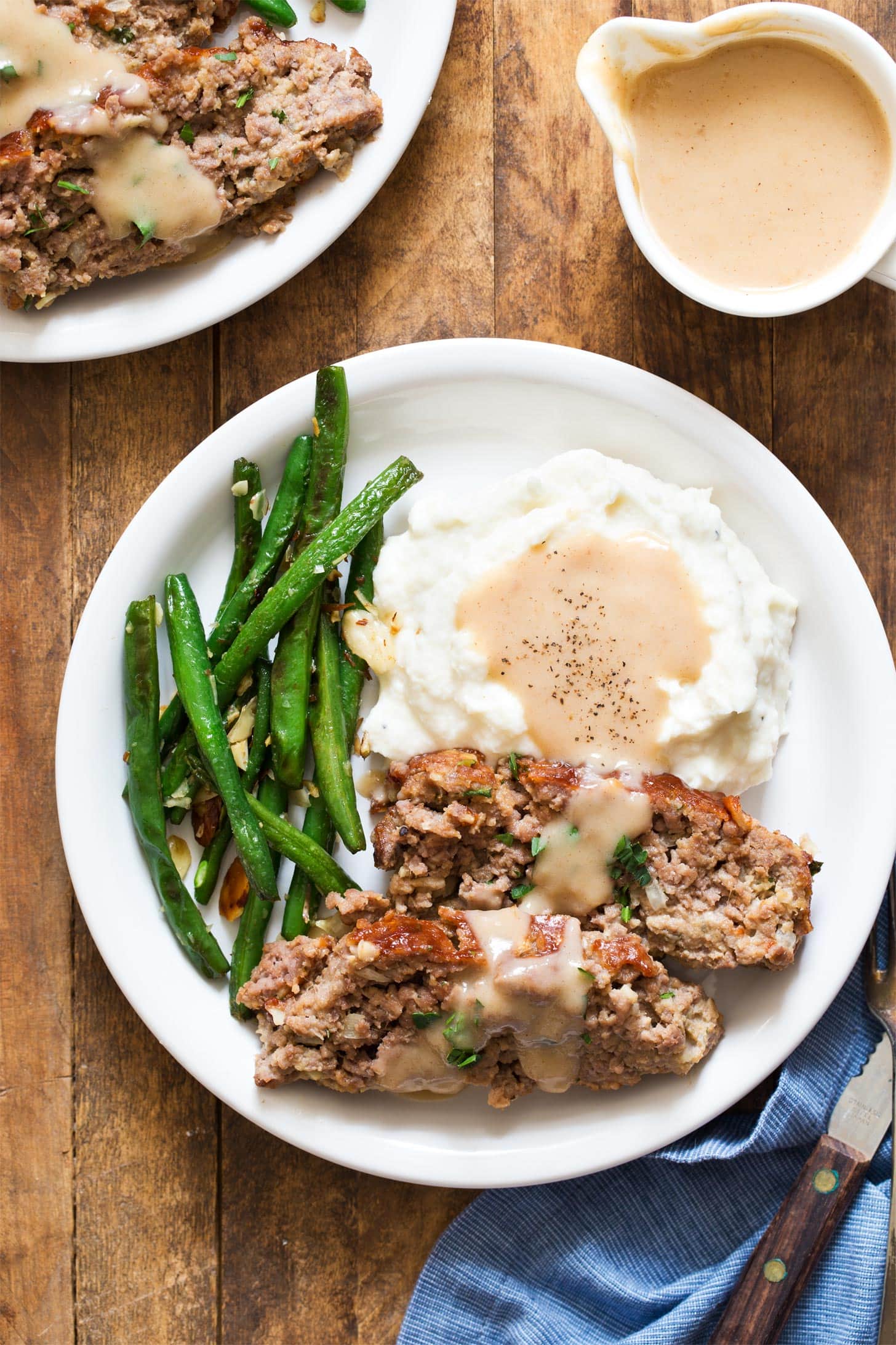 As mentioned earlier I served my meatloaf with mashed potatoes, gravy, and green beans for a balanced dinner for two.